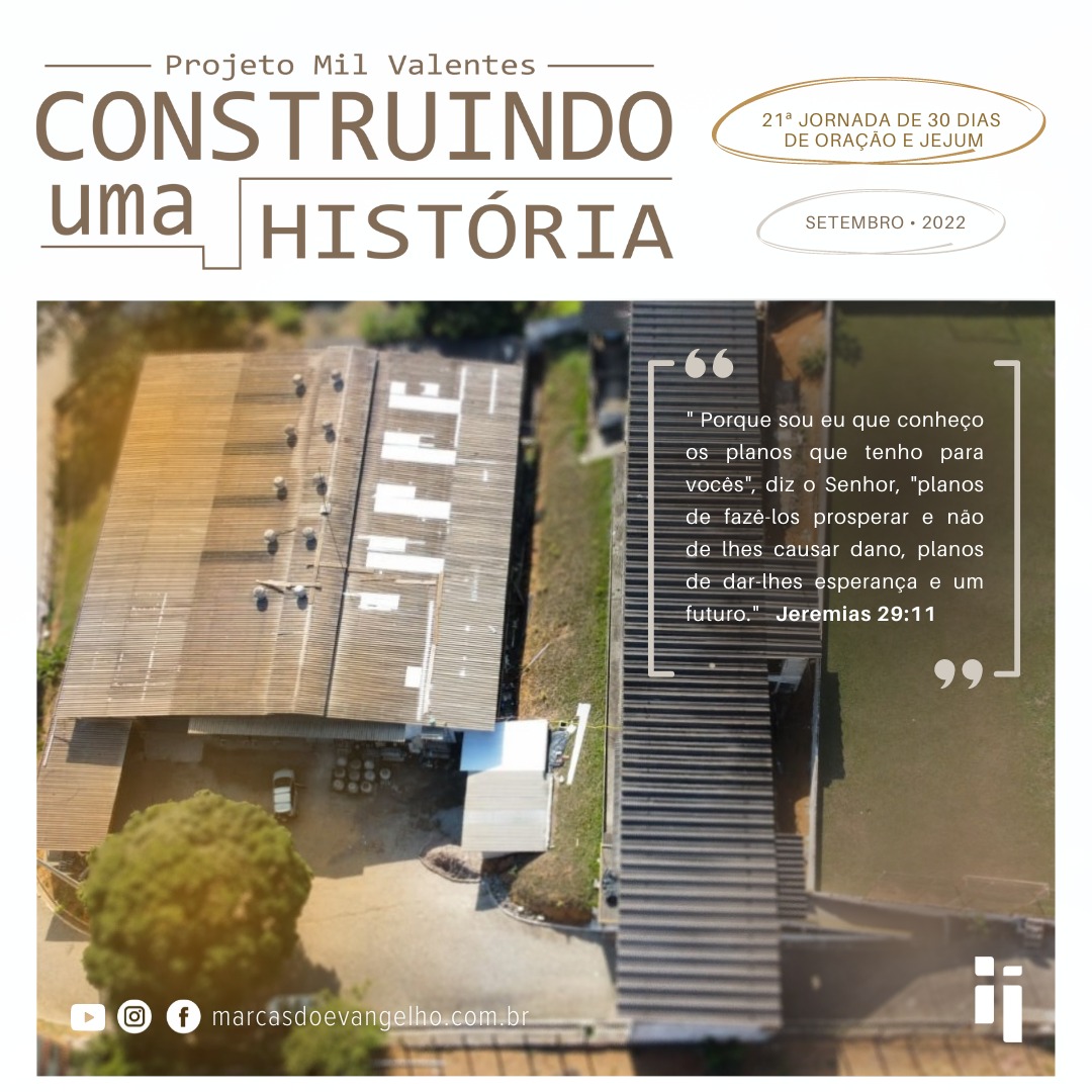 Estaremos orando e jejuando pelo Projeto Mil Valentes: “CONSTRUINDO UMA HISTÓRIA”. Estaremos clamando a Deus pela compra do espaço de 6.000 metros quadrados (antiga Ducouro) onde estamos nos reunindo. Precisamos de pelo menos 1000 pessoas contribuindo mensalmente por 60 meses, para podermos comprar esse imóvel.